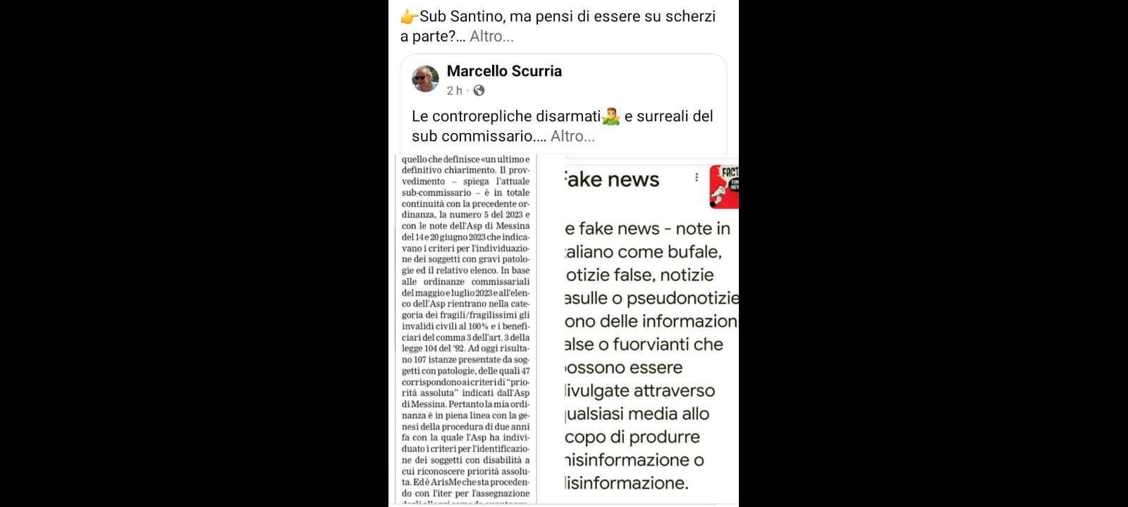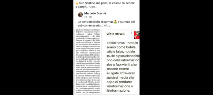 “Sub Santino, ma pensi di essere su scherzi a parte? Oggi incontrerai il Garante per l’infanzia e l’adolescenza, padre Giovanni Amante e il Garante dei diritti per le persone con disabilità, Tiziana De Maria: Gli spiegherai che non puoi revocare l’ordinanza che azzera la priorità sui fragili? Anche loro non hanno capito? Ma un pò di serietà? Le controrepliche disarmati e surreali del sub commissario”. A dirlo oggi, sul suo omonimo Profilo Facebook, è stato Marcello Scurria, ex sub commissario al Risanamento di Messina, ed avvocato messinese, rivolgendosi al suo successore, l’ingegnere Santino Trovato.